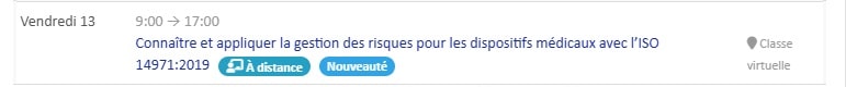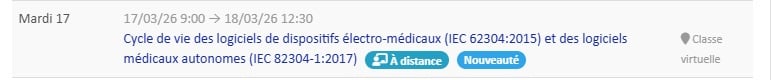 [2026-01-09] (Accès libre) Découvrez dès à présent nos premières dates de formation en INTER-entreprises pour 2026. Vous pouvez également nous demander des sessions de formation INTRA-entreprise sur votre site ou en classe virtuelle. Par ailleurs, nous proposons des formations e-learning sur les thématiques des règlements européens : sur les dispositifs médicaux (RDM) et sur les dispositifs médicaux de diagnostic in vitro (RDMDIV). L’accès au contenu est continu. Le projet de modification des règlements est discuté lors des sessions avec le formateur.