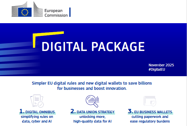 [2025-11-19] (Accès libre) La Commission européenne a publié le 19 novembre 2025 un « paquet numérique » (digital package) destiné à favoriser l’innovation des entreprises de l’Union européenne (UE).