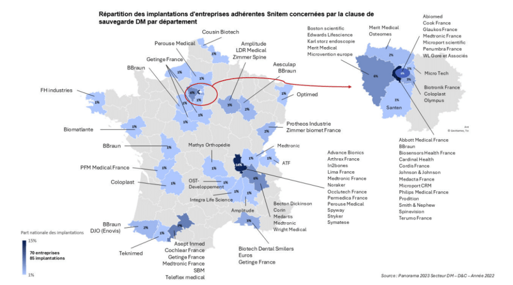 Une infographie du SNITEM présente la liste des entreprises concernées et leur localisation, avec des chiffres concrets alarmants. À titre d’exemple, pour une PME « type » du secteur des dispositifs médicaux implantables (37 salariés, forte activité de R&D) : le déclenchement de la clause pourrait représenter jusqu’à 25 % de sa masse salariale annuelle ou 35 % de son budget de recherche à reverser à l’État en une seule fois. À l’échelle nationale, ce sont 10 000 emplois directs, des centres de recherche et des sites industriels entiers qui sont exposés à un risque réel d’affaiblissement.