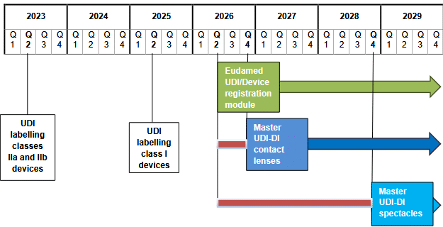 • Mise en œuvre du ‘Master UDI-DI’ pour les montures de lunettes, les verres de lunettes et les lunettes de lecture prémontées : 1ᵉʳ novembre 2028.